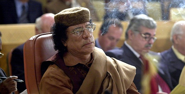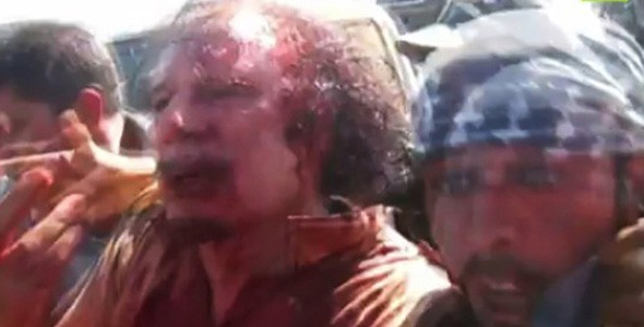 Η παραπάνω εικόνα, η οποία είναι από ένα βίντεο που μετέδωσε η λιβυκή τηλεόραση, φέρεται να δείχνει τον πρώην ηγέτη της Λιβύης ζωντανό, περιτριγυρισμένο από αντικαθεστωτικούς μαχητές, στις 20 Οκτωβρίου 2011. Το βίντεο απεικονίζει τους επαναστάτες να έχουν ακινητοποιήσει τον αιμόφυρτο Καντάφι, ο οποίος στηρίζεται στο καπό ενός φορτηγού.