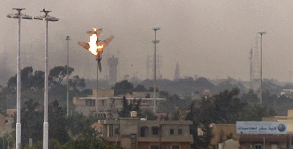 Μετά από εβδομάδες διαβουλεύσεων, στις αρχές Μαρτίου ο ΟΗΕ ενέκρινε τη χρήση στρατιωτικής δύναμης για τη δημιουργία μιας ζώνης εναέριου αποκλεισμού και την προστασία των Λίβυων πολιτών. Στις 19 Μαρτίου αμερικανικά αεροσκάφη πλήττουν στρατιωτικούς στόχους της χώρας. Ο Μπαράκ Ομπάμα δηλώνει: «Δεν μπορούμε να μένουμε άπραγοι όταν ένας τύραννος λέει στο λαό του πως δεν θα υπάρξει έλεος». Το NATO ανέλαβε τα ηνία των στρατιωτικών επιχειρήσεων σφυροκοπώντας τη χώρα για μια περίοδο πέντε μηνών, η οποία αποδείχτηκε κρίσιμης σημασίας για την επιτυχία της εξέγερσης.