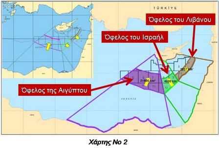 • Στο χάρτη Νο 2 αναγράφεται ότι σε περίπτωση που η Αίγυπτος, το Ισραήλ και ο Λίβανος προβούν στην οριοθέτηση της Α.Ο.Ζ. τους απευθείας με την Τουρκία τότε θα κερδίσουν θαλάσσια έκταση 21.500, 4.600 και 3.957 τετραγωνικά χλμ αντίστοιχα.