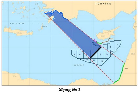 • Με το χάρτη Νο 3 ο Yaycı παρουσιάζει την πιθανή γραμμή οριοθέτησης της Α.Ο.Ζ. μεταξύ Τουρκίας και Ισραήλ, επισημαίνοντας ότι σε περίπτωση υλοποίησης της, ολόκληρο το οικόπεδο 12 και μέρος των οικοπέδων 1, 7, 8, 9, 10 και 11 που ανήκουν στην Κυπριακή Δημοκρατία θα περιέλθουν στην κυριότητα του Ισραήλ.