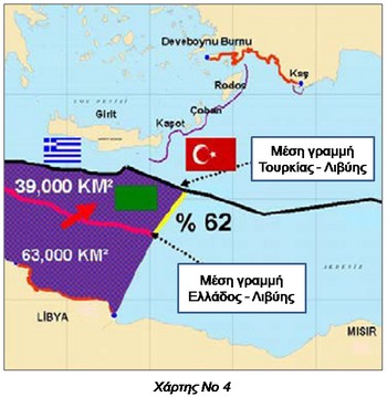 • Στο χάρτη Νο 4 παρουσιάζεται η μέση γραμμή μεταξύ Ελλάδος-Λιβύης και η μέση γραμμή μεταξύ Τουρκίας-Λιβύης. Ειδικότερα, σε περίπτωση οριοθέτησης της Α.Ο.Ζ. μεταξύ Τουρκίας και Λιβύης, ο πλοίαρχος Cihat Yaycı επισημαίνει ότι η Λιβύη θα αυξήσει τη θαλάσσια περιοχή της κατά 62% κερδίζοντας περίπου 39.000 τετραγωνικά χλμ. Μία άλλη βασική επισήμανση αποτελεί το γεγονός ότι προωθείται η στρατιωτική συνεργασία Τουρκίας-Λιβύης, βάσει της οποίας οι Τουρκικές Ένοπλες Δυνάμεις θα αναλάβουν την ανασυγκρότηση του στόλου και την εκπαίδευση του στρατού ξηράς και του πολεμικού ναυτικού της Λιβύης. Επιπρόσθετα, η Άγκυρα, μέσω του Τουρκικού Οργανισμού Συνεργασίας και Ανάπτυξης (ΤΙΚΑ), χορήγησε δωρεάν στο υπουργείο Εσωτερικών της Λιβύης στολές και εξοπλισμό για 6.000 αστυνομικούς, καθώς επίσης 30 αστυνομικά οχήματα. Τέλος, μέχρι τον Ιούλιο, 1.500 Λίβυοι αστυνομικοί θα μεταβούν σταδιακά στην Τουρκία για εκπαίδευση σε θέματα ασφάλειας και καθηκόντων σε σωφρονιστικά καταστήματα.