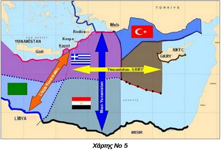 • Τέλος, ο Yaycı εκτιμά ότι μια ενδεχόμενη συμφωνία οριοθέτησης της Α.Ο.Ζ. μεταξύ Ελλάδος-Κυπριακής Δημοκρατίας θα αποτελέσει το πιο δυσμενές σενάριο για την Τουρκία, δεδομένου ότι η κατάσταση που θα διαμορφωθεί απεικονίζεται στον χάρτη Νο 5. Επίσης για αποφυγή της κατάστασης αυτής προτείνει την μονομερή ανακήρυξη της Α.Ο.Ζ. από την Τουρκία όπως έγινε και στη Μαύρη Θάλασσα.