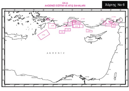 Η τουρκική Υδρογραφική Υπηρεσία με ανακοίνωσή της δημοσίευσε τους ακόλουθους χάρτες που περιλαμβάνουν τις περιοχές ασκήσεων και εκτέλεσης πυρών στην Ανατολική Μεσόγειο και στο Αιγαίο για το έτος 2012 (χάρτες 6 και 7), καθώς επίσης τα όρια της τουρκικής περιοχής έρευνας και διάσωσης (χάρτης 8).