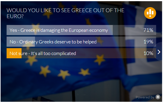 Στο μεταξύ σε διαδραστική δημοσκόπηση που φιλοξενείται στο δημοσίευμα της Telegraph σε σύνολο 1.063 συμμετεχόντων-αναγνωστών μέχρι στιγμής, το 71% επιθυμεί να δει την Ελλάδα να βγαίνει από το ευρώ εκτιμώντας ότι η χώρα βλάπτει την ευρωπαϊκή οικονομία. «Όχι» σε Grexit λέει το 19% υποστηρίζοντας ότι οι απλοί Έλληνες αξίζουν να βοηθούν, ενώ αβέβαιοι λόγω της πολυπλοκότητας του ζητήματος δηλώνει το 10%.